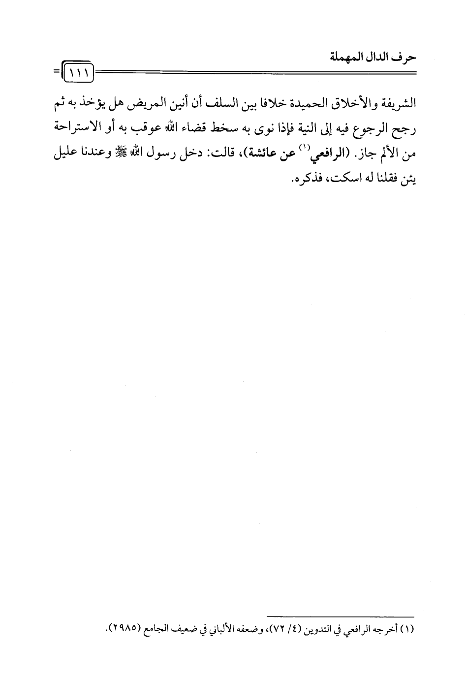الشريفة والأخلاق الحميدة خلافا بين السلف أن أنين المريض هل يؤخذ به ثم رجح الرجوع فيه إلى النية فإذا نوى به سخط قضاء الله عوقب به أو الاستراحة من الألم جاز. (الرافعي (¬1) عن عائشة)، قالت: دخل رسول الله - صلى الله عليه وسلم - وعندنا عليل يئن فقلنا له اسكت، فذكره.