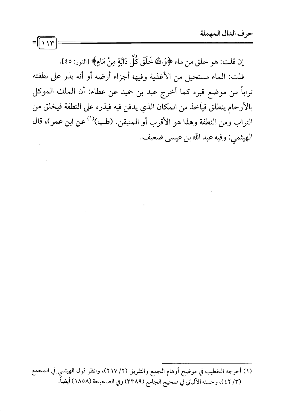 قلت: الماء مستحيل من الأغذية وفيها أجزاء أرضه أو أنه يذر على نطفته تراباً من موضع قبره كما أخرج عبد بن حميد عن عطاء: أن الملك الموكل بالأرحام ينطلق فيأخذ من المكان الذي يدفن فيه فيذره على النطفة فيخلق من التراب ومن النطفة وهذا هو الأقرب أو المتيقن. (طب) (¬1) عن ابن عمر)، قال الهيثمي: وفيه عبد الله بن عيسى ضعيف.