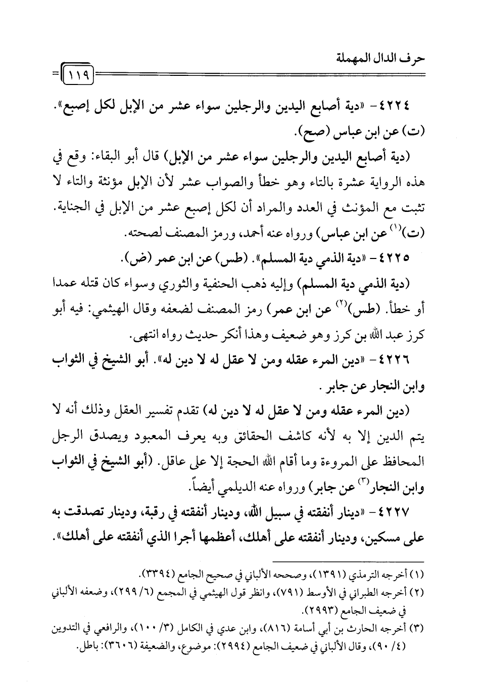 4224 - "دية أصابع اليدين والرجلين سواء عشر من الإبل لكل إصبع". (ت) عن ابن عباس (صح).