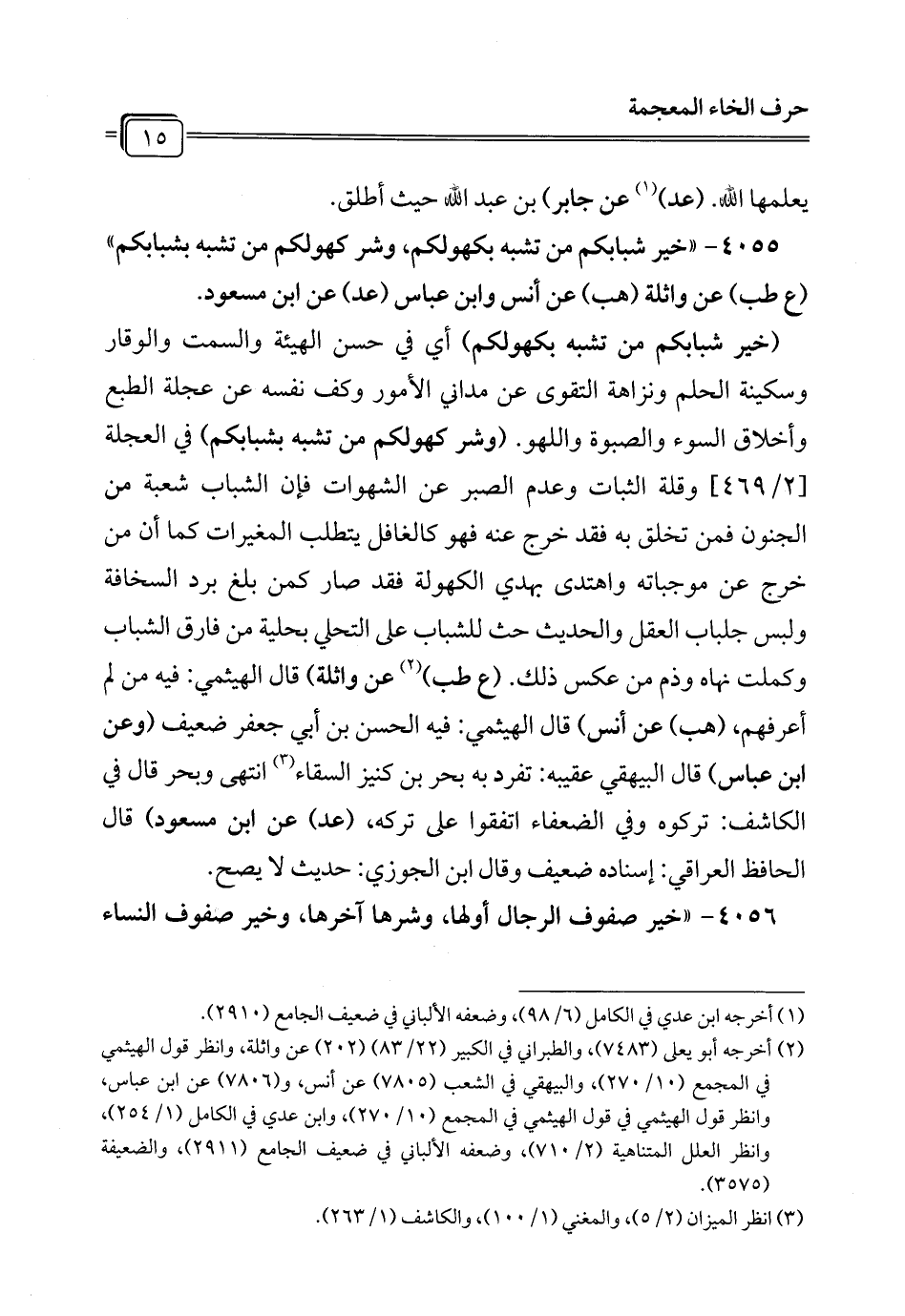 4055 - "خير شبابكم من تشبه بكهولكم، وشر كهولكم من تشبه بشبابكم" (ع طب) عن واثلة (هب) عن أنس وابن عباس (عد) عن ابن مسعود.