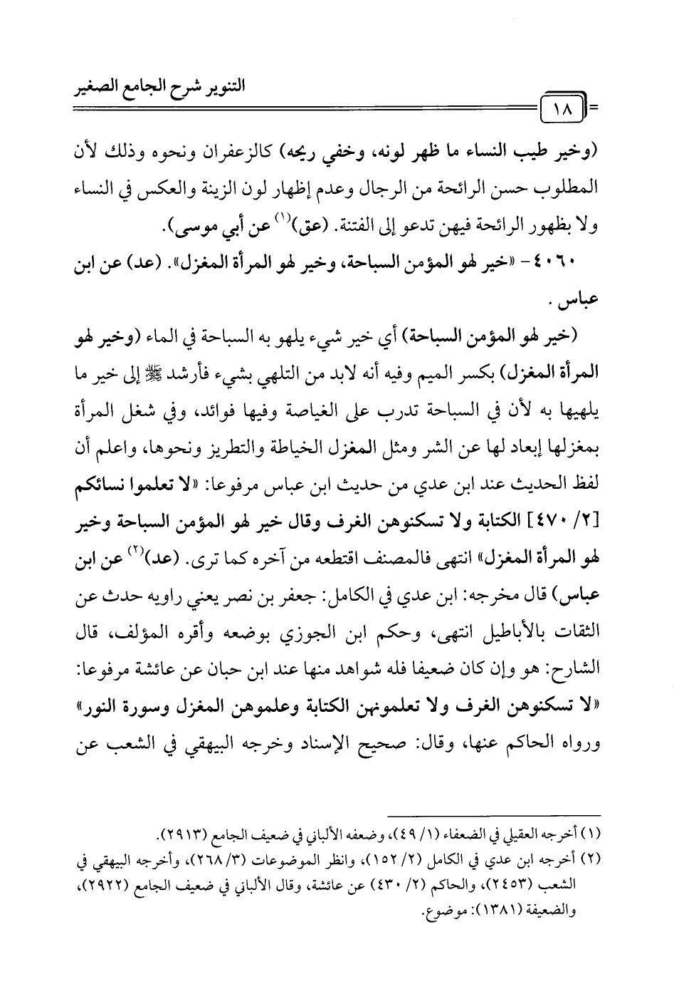 (خير لهو المؤمن السباحة) أي خير شيء يلهو به السباحة في الماء (وخير لهو المرأة المغزل) بكسر الميم وفيه أنه لا بد من التلهي بشيء فأرشد - صلى الله عليه وسلم - إلى خير ما يلهيها به لأن في السباحة تدرب على الغياصة وفيها فوائد، وفي شغل المرأة بمغزلها إبعاد لها عن الشر ومثل المغزل الخياطة والتطريز ونحوها، واعلم أن لفظ الحديث عند ابن عدي من حديث ابن عباس مرفوعاً: "لا تعلموا نسائكم [2/ 470] الكتابة ولا تسكنوهن الغرف وقال خير لهو المؤمن السباحة وخير لهو المرأة المغزل" انتهى فالمصنف اقتطعه من آخره كما ترى. (عد) (¬2) عن ابن عباس) قال مخرجه: ابن عدي في الكامل: جعفر بن نصر يعني راويه حدث عن الثقات بالأباطيل انتهى، وحكم ابن الجوزي بوضعه وأقره المؤلف، قال الشارح: هو وإن كان ضعيفاً فله شواهد منها عند ابن حبان عن عائشة مرفوعاً: "لا تسكنوهن الغرف ولا تعلمونهن الكتابة وعلموهن المغزل وسورة النور" ورواه الحاكم عنها، وقال: صحيح الإسناد وخرجه البيهقي في الشعب عن