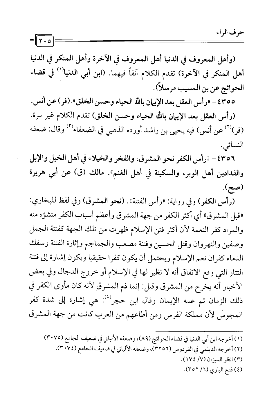 4356 - "رأس الكفر نحو المشرق، والفخر والخيلاء في أهل الخيل والإبل والفدادين أهل الوبر، والسكينة في أهل الغنم". مالك (ق) عن أبي هريرة (صح).