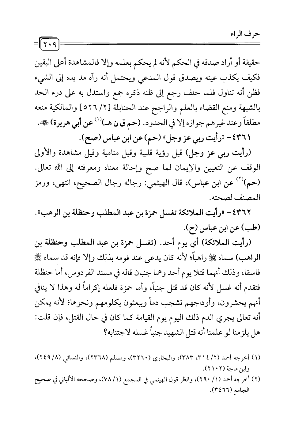 (رأيت الملائكة) أي يوم أحد. (تغسل حمزة بن عبد المطلب وحنظلة بن الراهب) سماه - صلى الله عليه وسلم - راهباً؛ لأنه كان يدعى عند قومه بذلك وإلا فإنه قد سماه - صلى الله عليه وسلم - فاسقا، وذلك أنهما قتلا يوم أحد وهما جنبان قاله في مسند الفردوس، أما حنظلة فتقدم أنه غسل لأنه كان قد قتل جنباً، وأما حمزة فلعله إكراماً له وهذا لا ينافي أنهم يحشرون، وأوداجهم تشجب دماً ويبعثون بكلومهم ونحوها؛ لأنه يمكن أنه تعالى يجري الدم ذلك اليوم يوم القيامة كما كان في حال القتل، فإن قلت: هل يلزمنا لو علمنا أنه قتل الشهيد جنباً غسله لاجتنابه؟