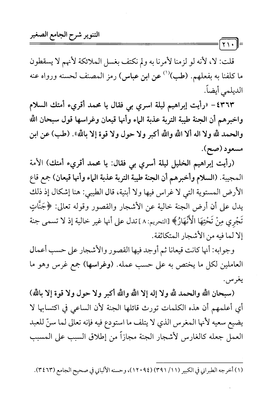 4363 - "رأيت إبراهيم ليلة اسري بي فقال يا محمَّد أقرئ أمتك السلام وأخبرهم أن الجنة طيبة التوبة عذبة الهاء وأنها قيعان وغراسها قول سبحان الله والحمد لله ولا إله إلا الله والله أكبر ولا حول ولا قوة إلا بالله". (طب) عن ابن مسعود (صح).