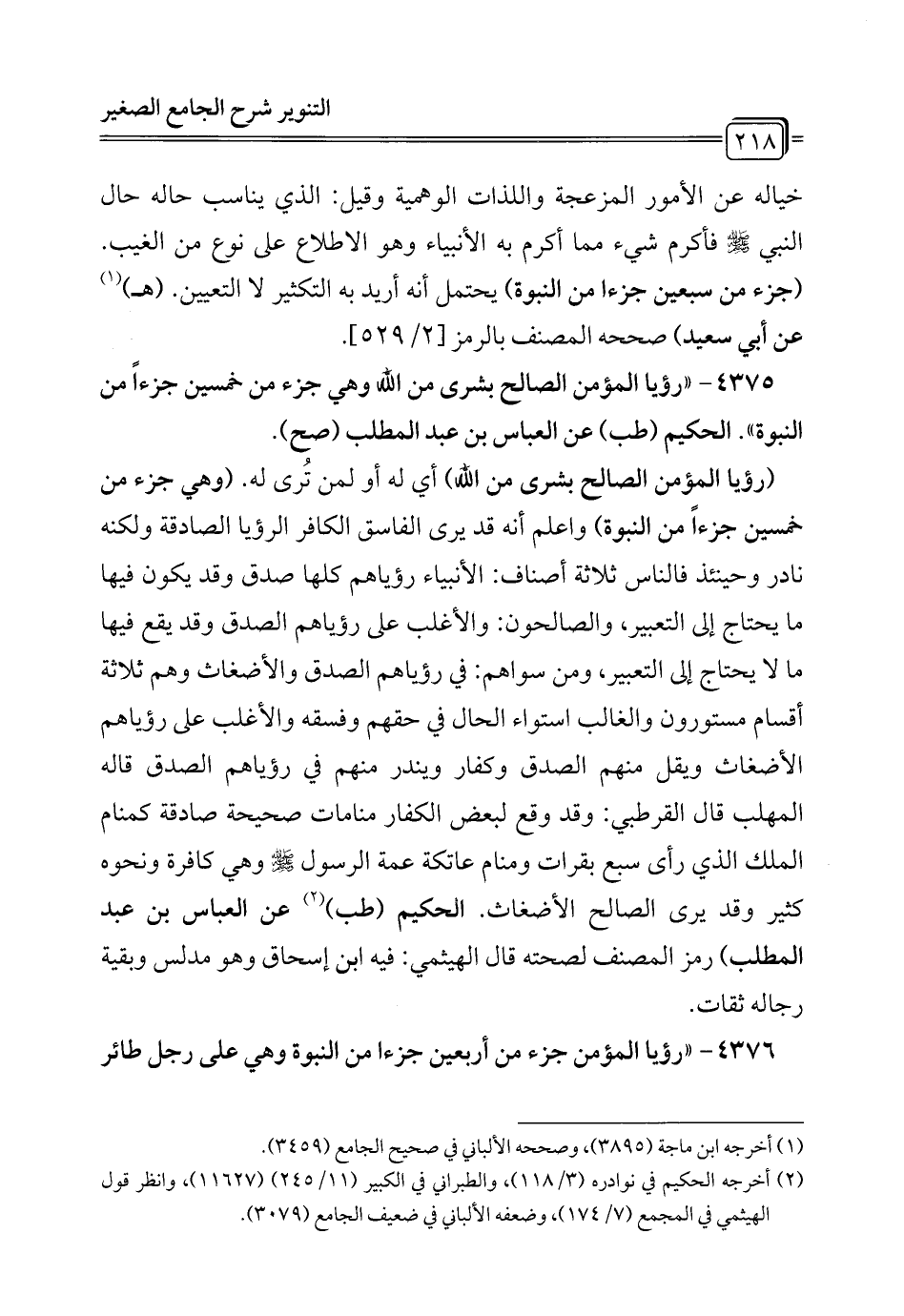 4375 - "رؤيا المؤمن الصالح بشرى من الله وهي جزء من خمسين جزءاً من النبوة". الحكيم (طب) عن العباس بن عبد المطلب (صح).