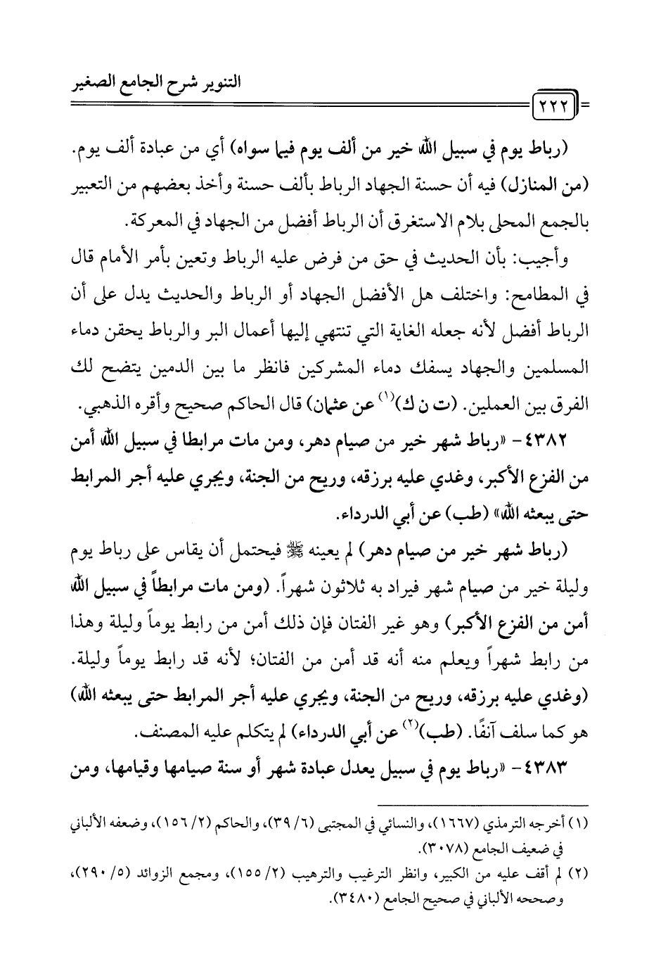 4383 - "رباط يوم في سبيل يعدل عبادة شهر أو سنة صيامها وقيامها، ومن