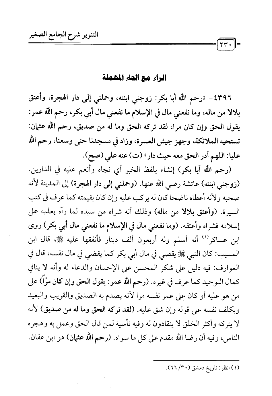 (رحم الله أبا بكر) إنشاء بلفظ الخبر أي نجاه وأنعم عليه في الدارين. (زوجني ابنته) عائشة رضي الله - رضي الله عنها -. (وحملني إلى دار الهجرة) إلى المدينة لأنه صحبه ولأنه أعطاه ناضحا كان له يركب عليه وإن كان بقيمته كما عرف في كتب السيرة. (وأعتق بلالاً من ماله) وذلك أنه شراه من سيده لما رآه يعذبه على إسلامه فشراه وأعتقه. (وما نفعني مال في الإِسلام ما نفعني مال أبي بكر) روى ابن عساكر (¬1) أنه أسلم وله أربعون ألف دينار فأنفقها عليه - صلى الله عليه وسلم -، قال ابن المسيب: كان النبي - صلى الله عليه وسلم - يقضي في مال أبي بكر كما يقضي في مال نفسه، قال في العوارف: فيه دليل على شكر المحسن على الإحسان والدعاء له وأنه لا ينافي كمال التوحيد كما عرف في غيره. (رحم الله عمر: يقول الحق وإن كان مرًّا) على من هو عليه أو كان على عمر نفسه مرا لأنه يصدم به الصديق والقريب والبعيد ويكلف نفسه على قوله وإن شق عليه. (لقد تركه الحق وما له من صديق) لأنه لا يتركه وأكثر الخلق لا ينقادون له وفيه تأسية لمن قال الحق وعمل به وهجره الناس، وفيه أن رضا الله مقدم على كل ما سواه. (رحم الله عثمان) هو ابن عفان.