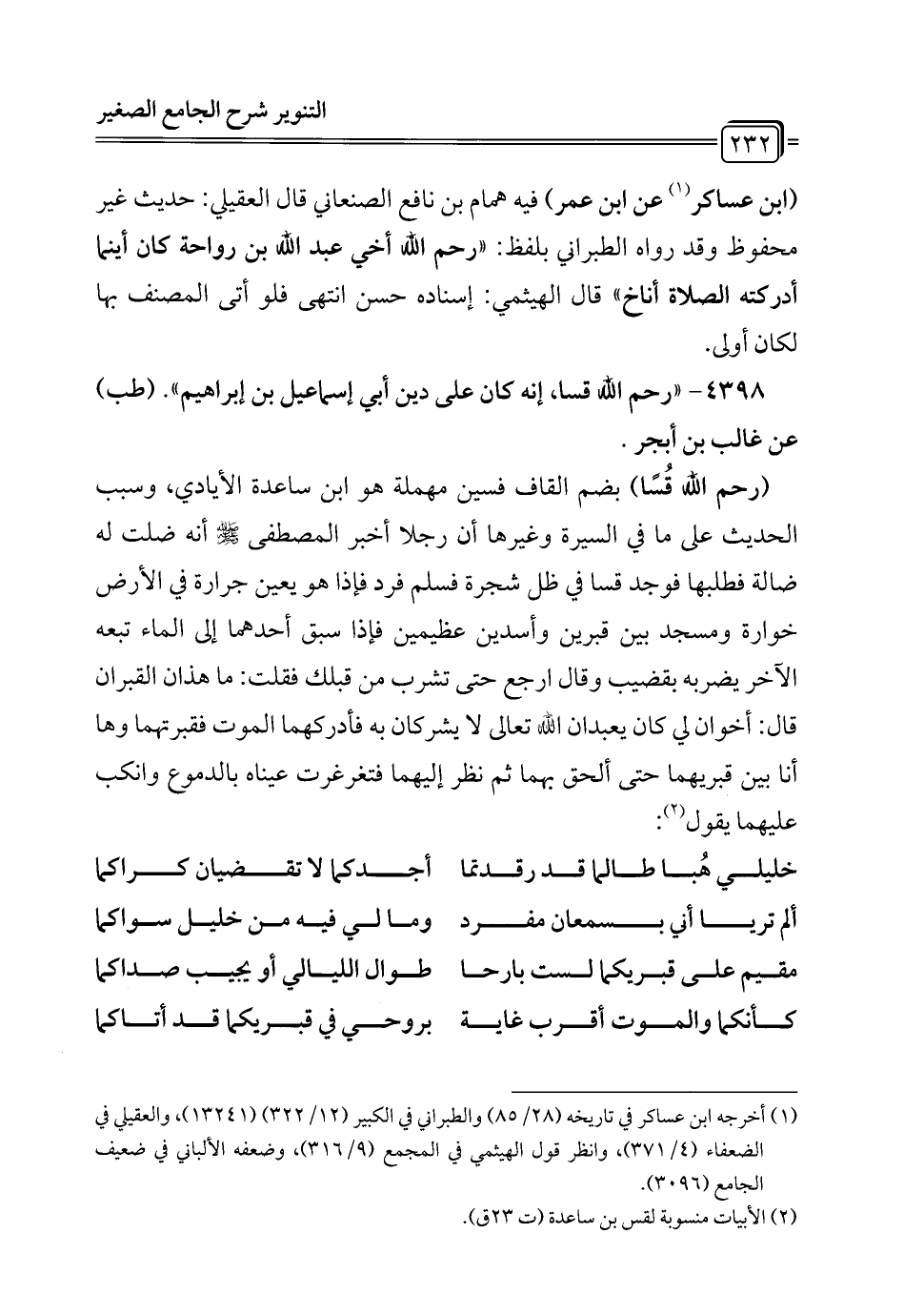 (رحم الله قُسًا) بضم القاف فسين مهملة هو ابن ساعدة الأيادي، وسبب الحديث على ما في السيرة وغيرها أن رجلاً أخبر المصطفى - صلى الله عليه وسلم - أنه ضلت له ضالة فطلبها فوجد قسا في ظل شجرة فسلم فرد فإذا هو يعين جرارة في الأرض خوارة ومسجد بين قبرين وأسدين عظيمين فإذا سبق أحدهما إلى الماء تبعه الآخر يضربه بقضيب وقال ارجع حتى تشرب من قبلك فقلت: ما هذان القبران قال: أخوان لي كان يعبدان الله تعالى لا يشركان به فأدركهما الموت فقبرتهما وها أنا بين قبريهما حتى ألحق بهما ثم نظر إليهما فتغرغرت عيناه بالدموع وانكب عليهما يقول (¬2):