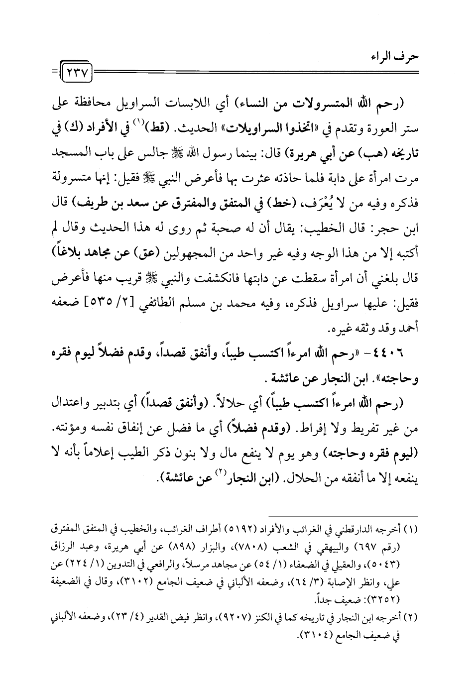 (رحم الله المتسرولات من النساء) أي اللابسات السراويل محافظة على ستر العورة وتقدم في "اتخذوا السراويلات" الحديث. (قط) (¬1) في الأفراد (ك) في تاريخه (هب) عن أبي هريرة) قال: بينما رسول الله - صلى الله عليه وسلم - جالس على باب المسجد مرت امرأة على دابة فلما حاذته عثرت بها فأعرض النبي - صلى الله عليه وسلم - فقيل: إنها متسرولة فذكره وفيه من لا يُعْرَف، (خط) في المتفق والمفترق عن سعد بن طريف) قال ابن حجر: قال الخطيب: يقال أن له صحبة ثم روى له هذا الحديث وقال لم أكتبه إلا من هذا الوجه وفيه غير واحد من المجهولين (عق) عن مجاهد بلاغاً) قال بلغني أن امرأة سقطت عن دابتها فانكشفت والنبي - صلى الله عليه وسلم - قريب منها فأعرض فقيل: عليها سراويل فذكره، وفيه محمَّد بن مسلم الطائفي [2/ 535] ضعفه أحمد وقد وثقه غيره.