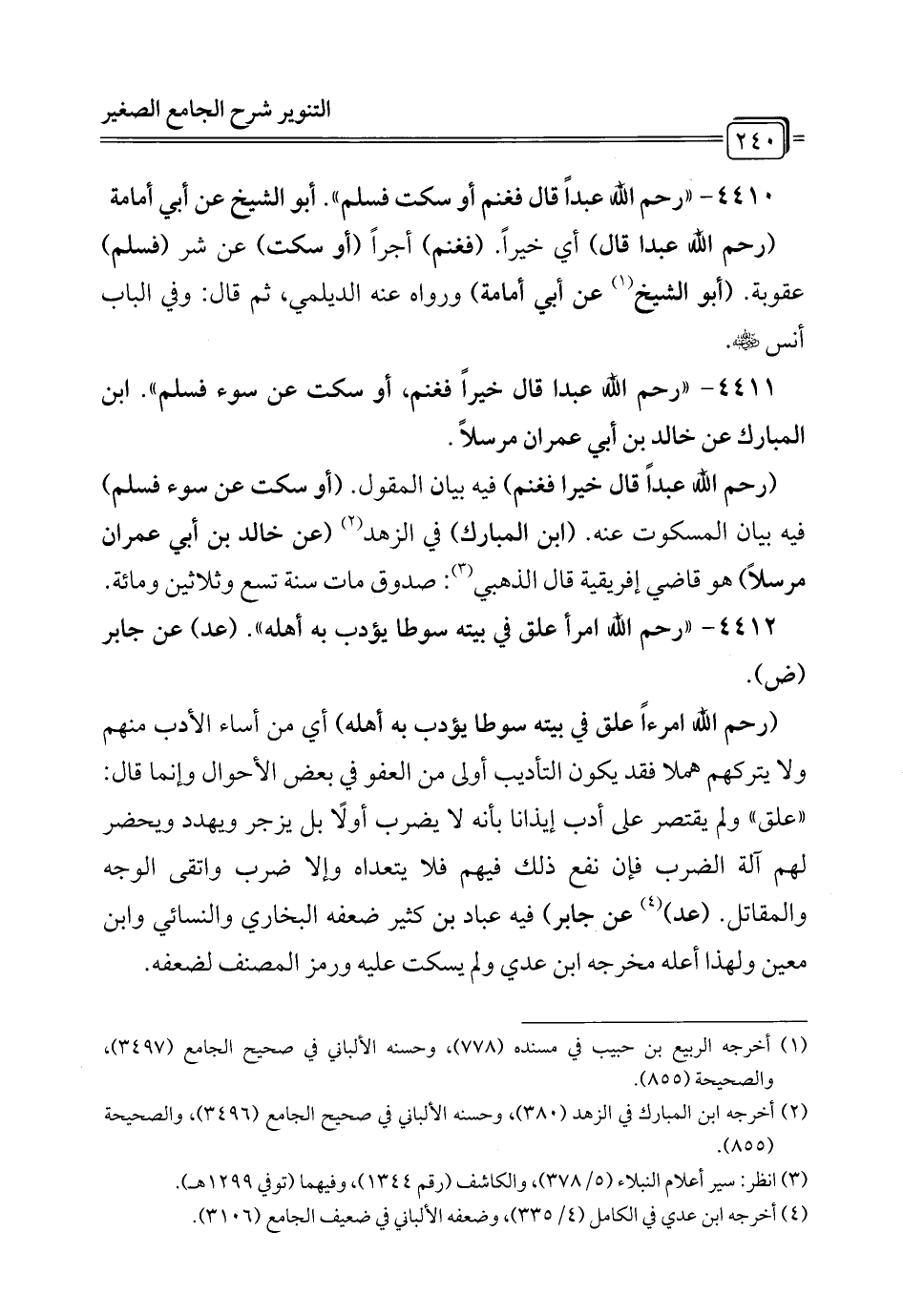 4411 - "رحم الله عبدا قال خيراً فغنم، أو سكت عن سوء فسلم". ابن المبارك عن خالد بن أبي عمران مرسلاً.