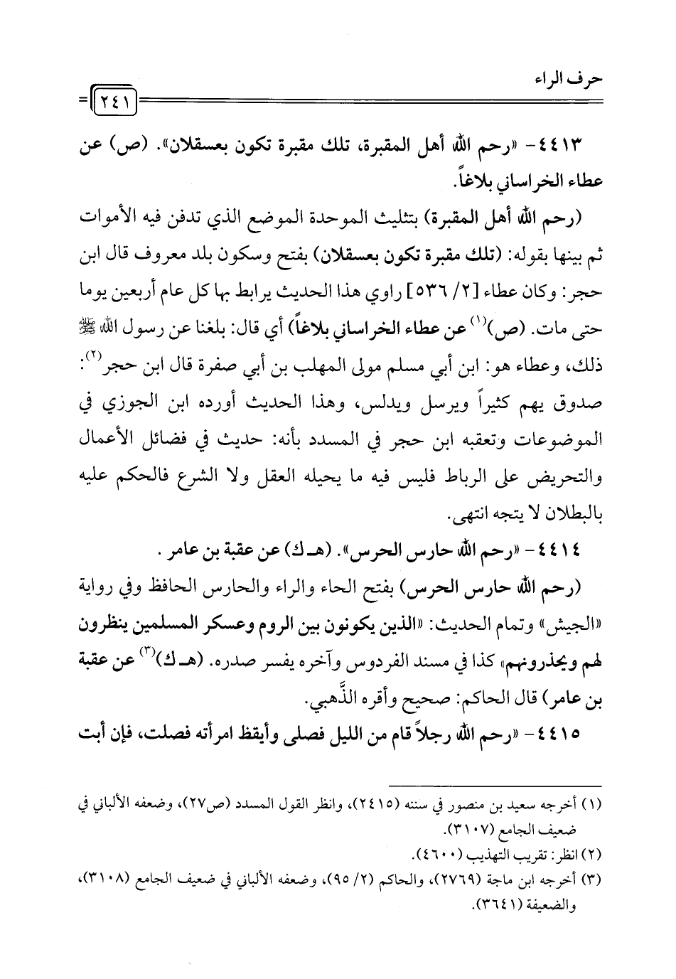 4413 - "رحم الله أهل المقبرة، تلك مقبرة تكون بعسقلان". (ص) عن عطاء الخراساني بلاغاً.