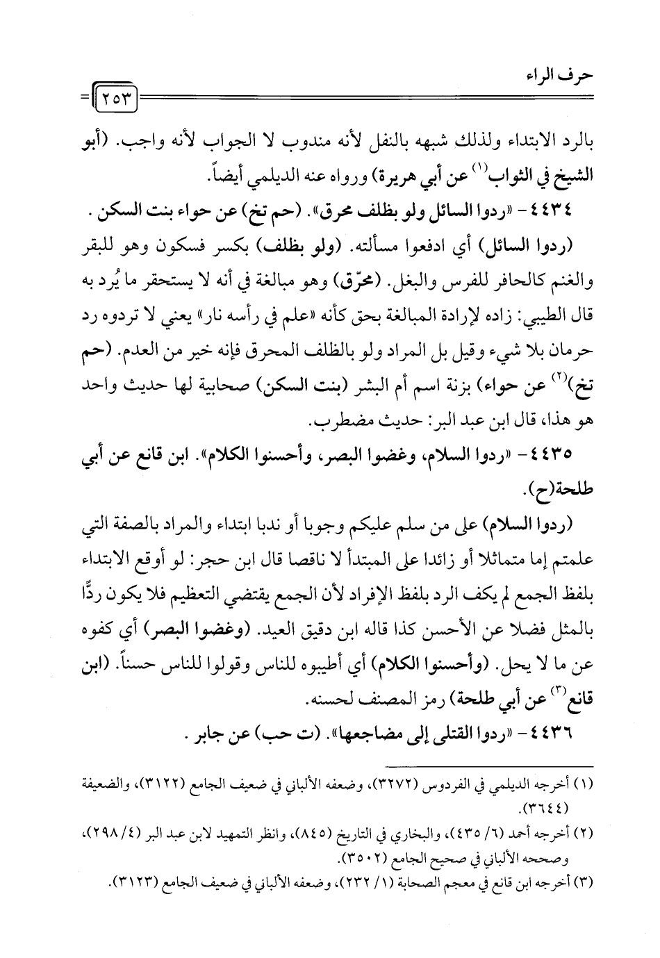 4435 - "ردوا السلام، وغضوا البصر، وأحسنوا الكلام". ابن قانع عن أبي طلحة (ح).