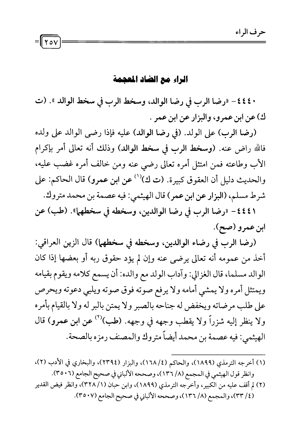 4441 - "رضا الرب في رضا الوالدين، وسخطه في سخطهما". (طب) عن ابن عمرو (صح).