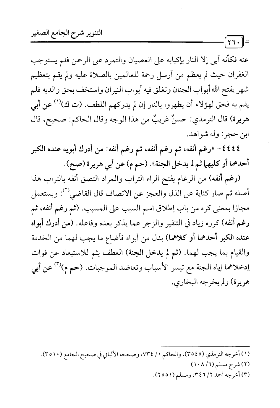 4444 - "رغم أنفه، ثم رغم أنفه، ثم رغم أنفه: من أدرك أبويه عنده الكبر أحدهما أو كليهما ثم لم يدخل الجنة". (حم م) عن أبي هريرة (صح).