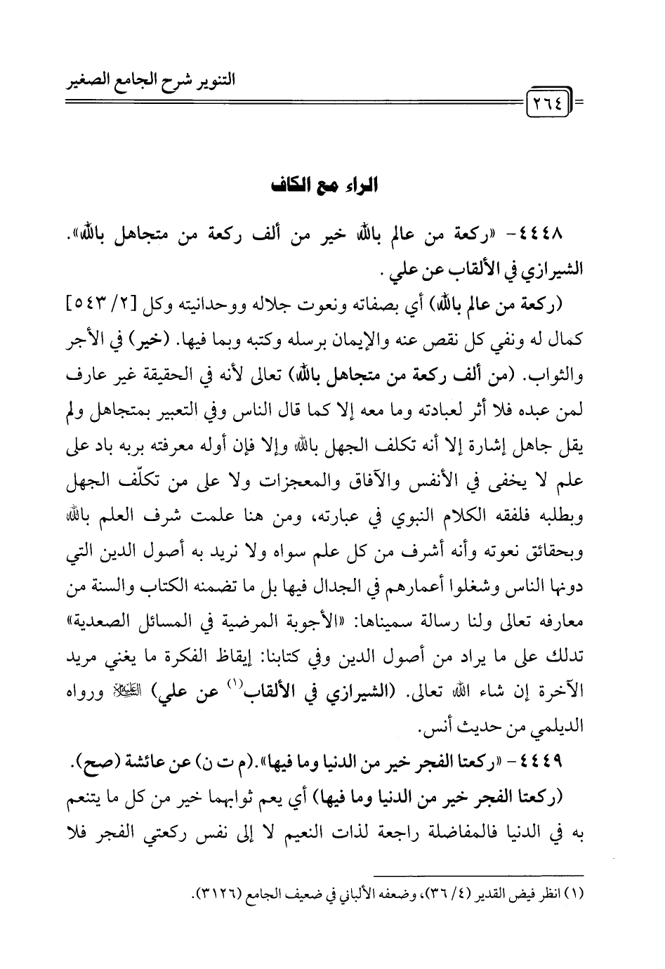 4448 - " ركعة من عالم بالله خير من ألف ركعة من متجاهل بالله". الشيرازي في الألقاب عن علي.