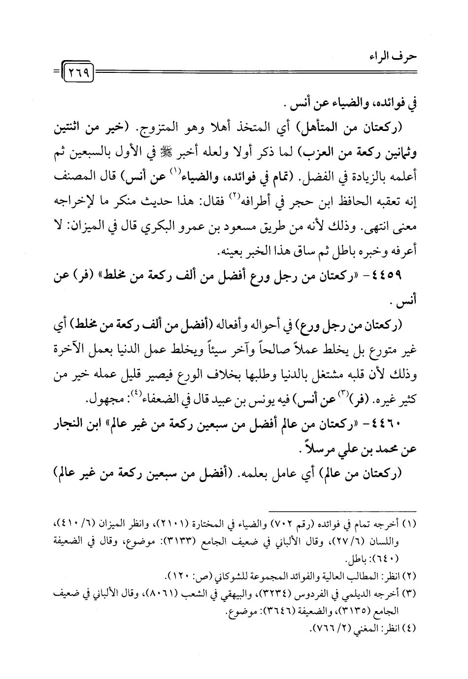 4460 - "ركعتان من عالم أفضل من سبعين ركعة من غير عالم" ابن النجار عن محمَّد بن علي مرسلاً.