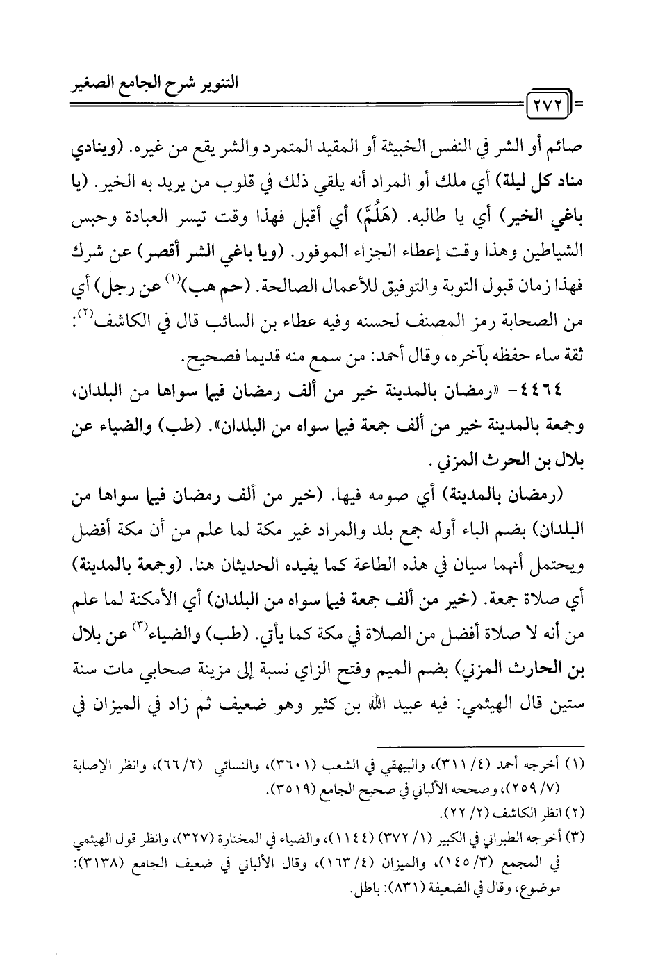 4464 - "رمضان بالمدينة خير من ألف رمضان فيما سواها من البلدان، وجمعة بالمدينة خير من ألف جمعة فيما سواه من البلدان". (طب) والضياء عن بلال بن الحرث المزني.