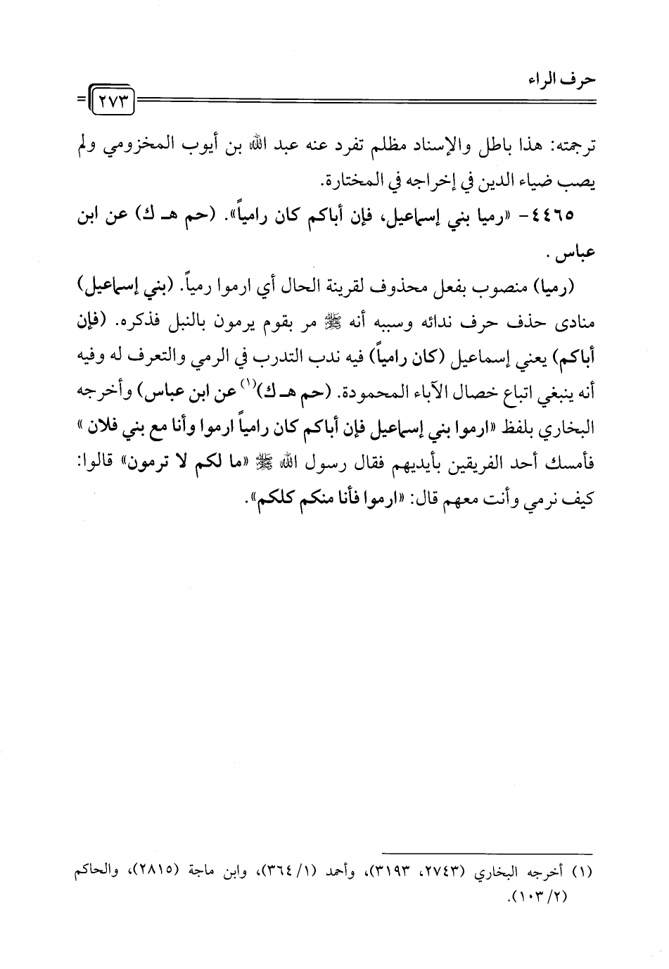 4465 - "رميا بني إسماعيل، فإن أباكم كان رامياً". (حم هـ ك) عن ابن عباس.