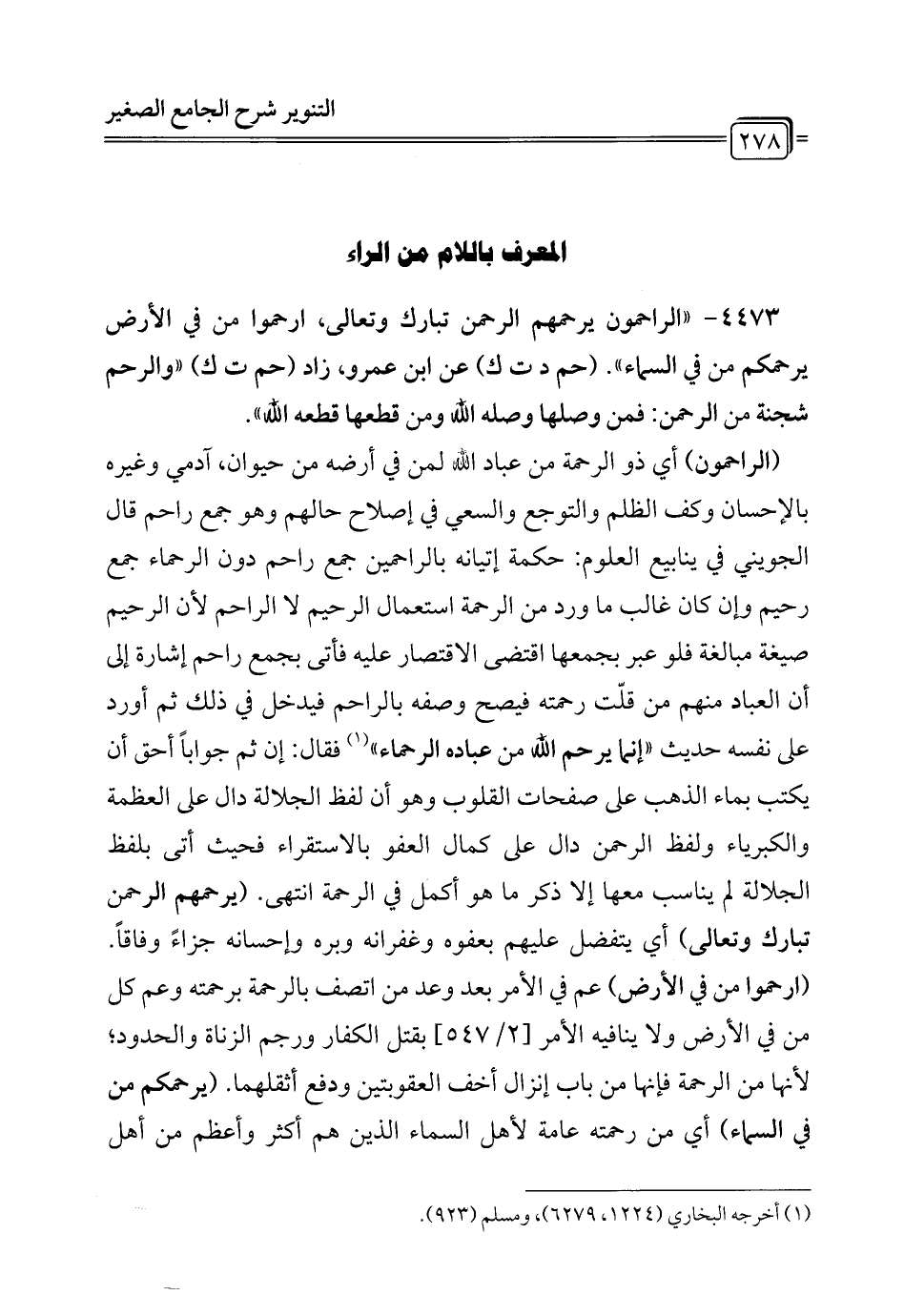 4473 - " الراحمون يرحمهم الرحمن تبارك وتعالى، ارحموا من في الأرض يرحمكم من في السماء". (حم د ت ك) عن ابن عمرو، زاد (حم ت ك) "والرحم شجنة من الرحمن: فمن وصلها وصله الله ومن قطعها قطعه الله".