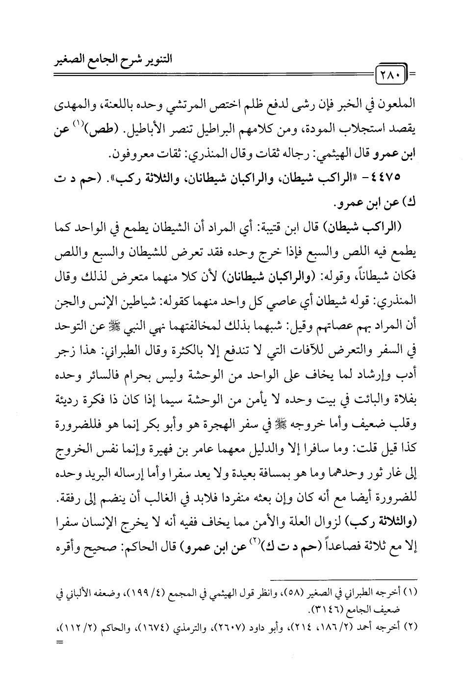 4475 - "الراكب شيطان، والراكبان شيطانان، والثلاثة ركب". (حم د ت ك) عن ابن عمرو.