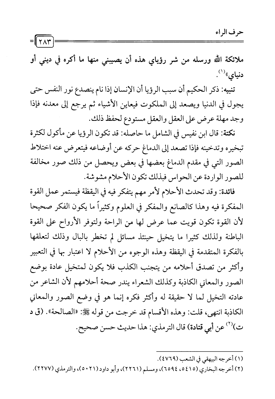 تنبيه: ذكر الحكيم أن سبب الرؤيا أن الإنسان إذا نام ينصدع نور النفس حتى يجول في الدنيا ويصعد إلى الملكوت فيعاين الأشياء تم يرجع إلى معادنه فإذا وجد مهلة عرض على العقل والعقل مستودع لحفظ ذلك.