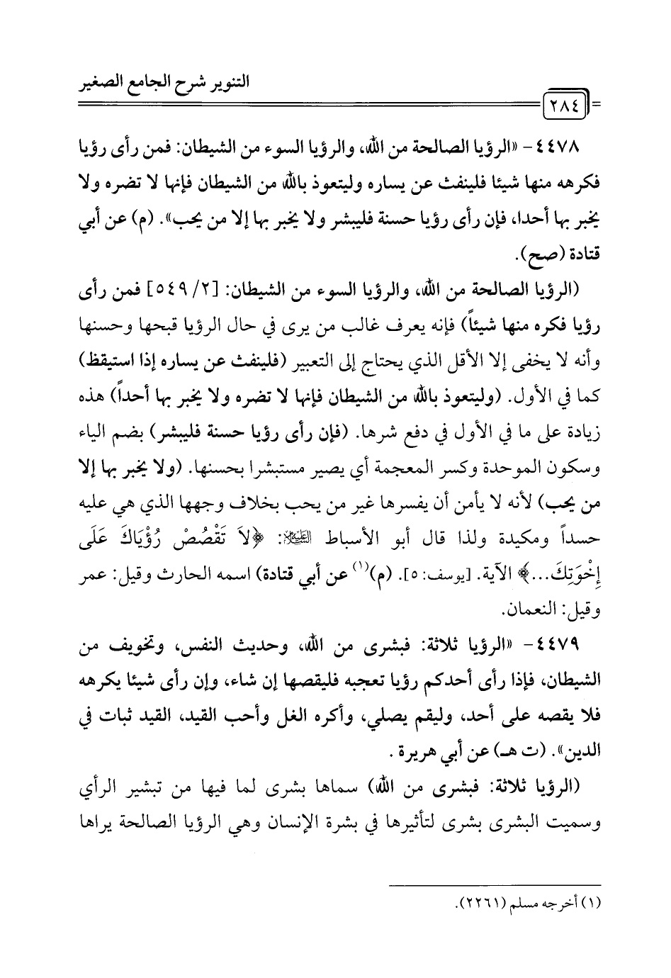 4478 - "الرؤيا الصالحة من الله، والرؤيا السوء من الشيطان: فمن رأى رؤيا فكرهه منها شيئاً فلينفث عن يساره وليتعوذ بالله من الشيطان فإنها لا تضره ولا يخبر بها أحدا، فإن رأى رؤيا حسنة فليبشر ولا يخبر بها إلا من يحب". (م) عن أبي قتادة (صح).