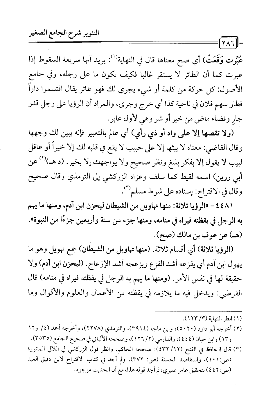 (ولا تقصها إلا على واد أو ذي رأي) أي عالم بالتعبير فإنه يبين لك وجهها وقال القاضي: معناه لا يبثها إلا على حبيب لا يقع في قلبه لك إلا خيراً أو عاقل لبيب لا يقول إلا بفكر بليغ ونظر صحيح ولا يواجهك إلا بخير. (د هـ) (¬2) عن أبي رزين) اسمه لقيط كما سلف وعزاه الزركشي إلى الترمذي وقال صحيح وقال في الاقتراح: إسناده على شرط مسلم (¬3).