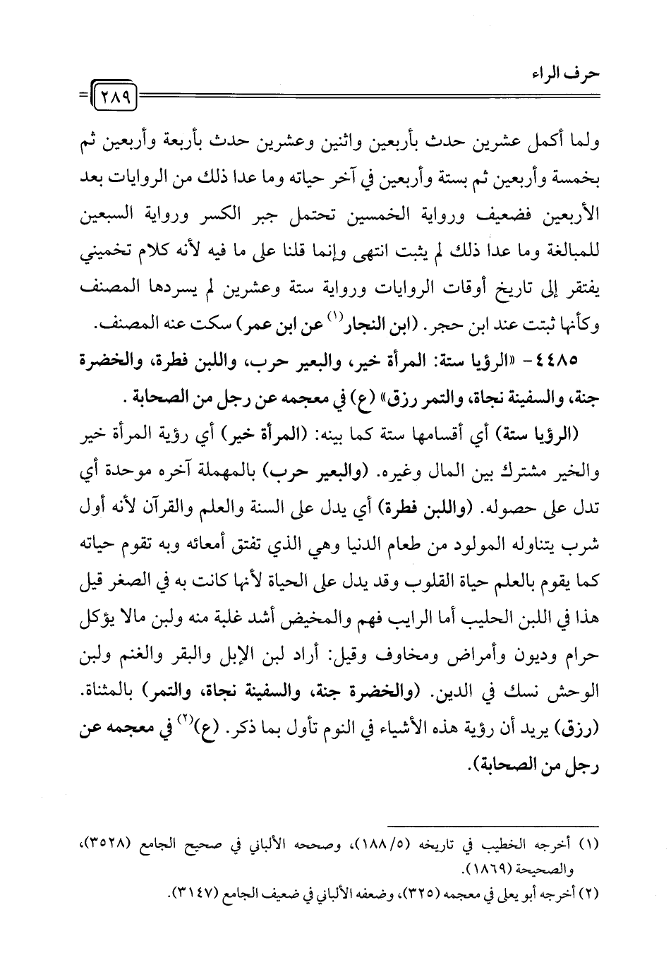 (الرؤيا ستة) أي أقسامها ستة كما بينه: (المرأة خير) أي رؤية المرأة خير والخير مشترك بين المال وغيره. (والبعير حرب) بالمهملة آخره موحدة أي تدل على حصوله. (واللبن فطرة) أي يدل على السنة والعلم والقرآن لأنه أول شرب يتناوله المولود من طعام الدنيا وهي الذي تفتق أمعائه وبه تقوم حياته كما يقوم بالعلم حياة القلوب وقد يدل على الحياة لأنها كانت به في الصغر قيل هذا في اللبن الحليب أما الرايب فهم والمخيض أشد غلبة منه ولبن ما لا يؤكل حرام وديون وأمراض ومخاوف وقيل: أراد لبن الإبل والبقر والغنم ولبن الوحش نسك في الدين. (والخضرة جنة والسفينة نجاة والتمر) بالمثناة. (رزق) يريد أن رؤية هذه الأشياء في النوم تأول بما ذكر. (ع) (¬2) في معجمه عن رجل من الصحابة).