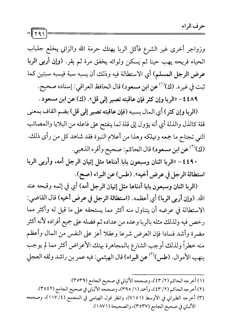 4490 - "الربا اثنان وسبعون بابا أدناها مثل إتيان الرجل أمه، وأربى الربا استطالة الرجل في عرض أخيه". (طس) عن البراء (صح).