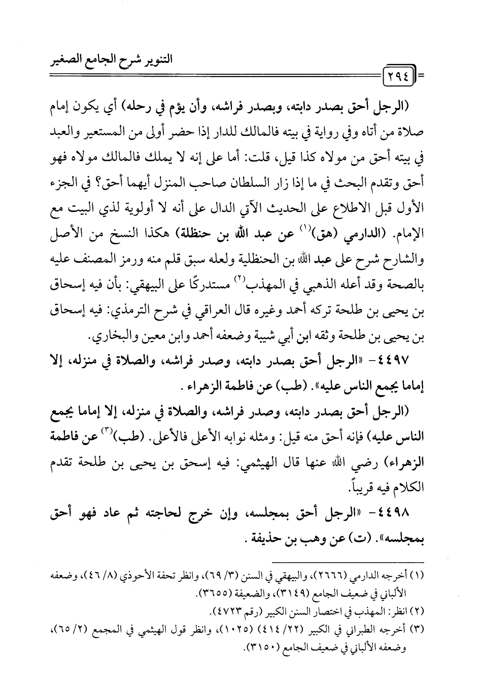 4497 - "الرجل أحق بصدر دابته، وصدر فراشه، والصلاة في منزله، إلا إماما يجمع الناس عليه". (طب) عن فاطمة الزهراء.