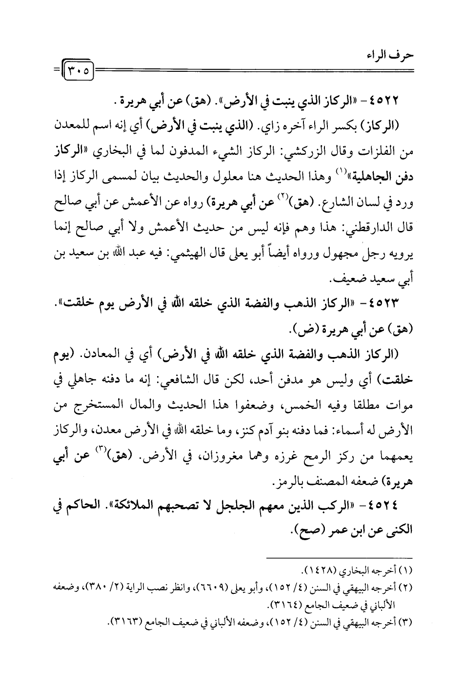4523 - "الركاز الذهب والفضة الذي خلقه الله في الأرض يوم خلقت". (هق) عن أبي هريرة (ض).