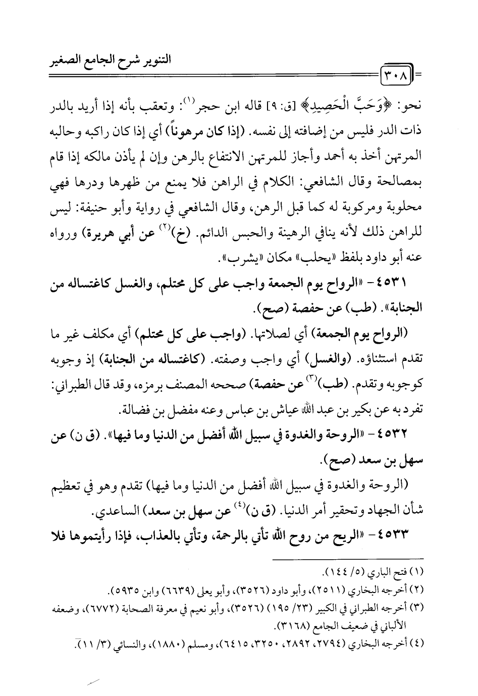4531 - "الرواح يوم الجمعة واجب على كل محتلم، والغسل كاغتساله من الجنابة". (طب) عن حفصة (صح).