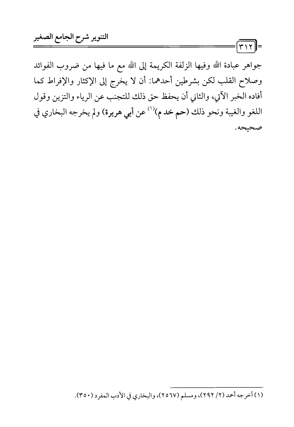 جواهر عبادة الله وفيها الزلفة الكريمة إلى الله مع ما فيها من ضروب الفوائد وصلاح القلب لكن بشرطين أحدهما: أن لا يخرج إلى الإكثار والإفراط كما أفاده الخبر الآتي، والثاني أن يحفظ حق ذلك للتجنب عن الرياء والتزين وقول اللغو والغيبة ونحو ذلك (حم خد م) (¬1) عن أبي هريرة) ولم يخرجه البخاري في صحيحه.