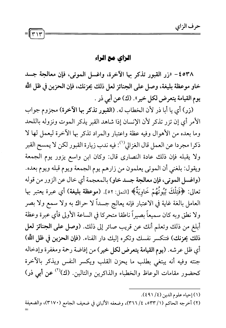4538 - " زر القبور تذكر بها الآخرة، واغسل الموتى، فإن معالجة جسد خاو موعظة بليغة، وصل على الجنائز لعل ذلك يحزنك، فإن الحزين في ظل الله يوم القيامة يتعرض لكل خير". (ك) عن أبي ذر.