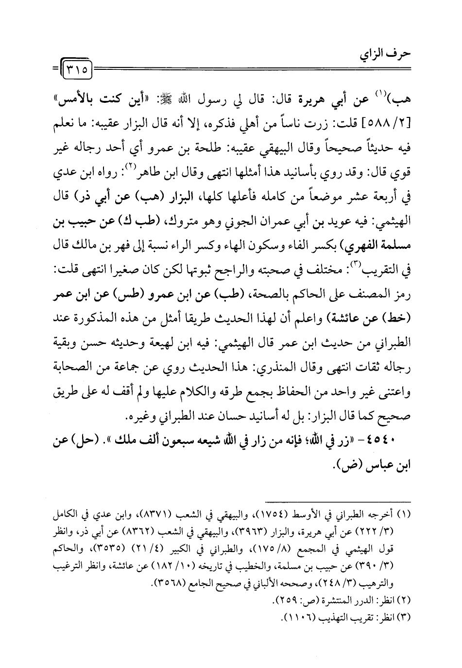 (¬1) أخرجه الطبراني في الأوسط (1754)، والبيهقي في الشعب (8371)، وابن عدي في الكامل (3/ 222) عن أبي هريرة، والبزار (3963)، والبيهقي في الشعب (8362) عن أبي ذر، وانظر قول الهيثمي في المجمع (8/ 175)، والطبراني في الكبير (4/ 21) (3535)، والحاكم (3/ 390) عن حبيب بن مسلمة، والخطيب في تاريخه (10/ 182) عن عائشة وانظر الترغيب والترهيب (3/ 248)، وصححه الألباني في صحيح الجامع (3568).
