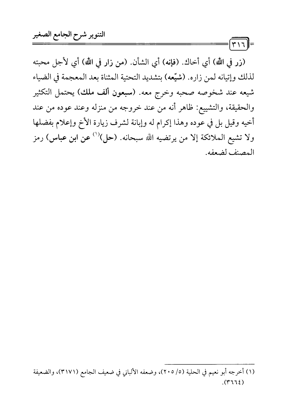 (زر في الله) أي أخاك. (فإنه) أي الشأن. (من زار في الله) أي لأجل محبته لذلك وإتيانه لمن زاره. (شيّعه) بتشديد التحتية المثناة بعد المعجمة في الضياء شيعه عند شخوصه صحبه وخرج معه. (سبعون ألف ملك) يحتمل التكثير والحقيقة، والتشييع: ظاهر أنه من عند خروجه من منزله وعند عوده من عند أخيه وقيل بل في عوده وهذا إكرام له وإبانة لشرف زيارة الأخ وإعلام بفضلها ولا تشيع الملائكة إلا من يرتضيه الله سبحانه. (حل) (¬1) عن ابن عباس) رمز المصنف لضعفه.