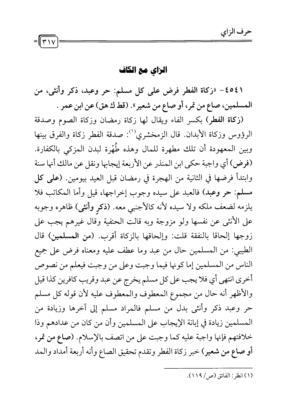 4541 - " زكاة الفطر فرض على كل مسلم: حر وعبد، ذكر وأنثى، من المسلمين، صاع من تمر، أو صاع من شعير". (قط ك هق) عن ابن عمر.
