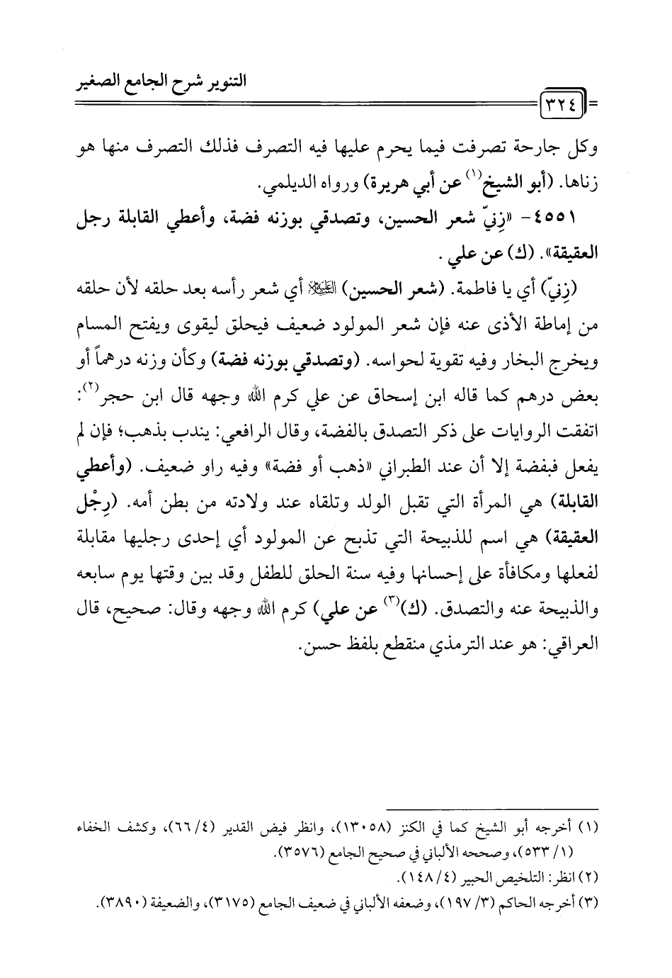 4551 - "زِنيّ شعر الحسين، وتصدقي بوزنه فضة، وأعطي القابلة رجل العقيقة". (ك) عن علي.