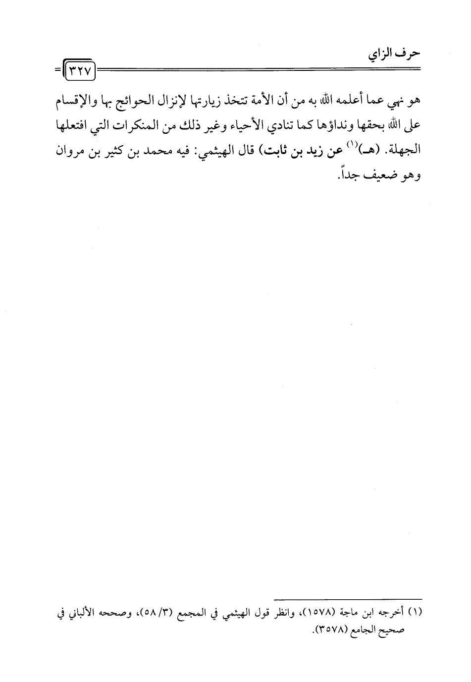 هو نهي عما أعلمه الله به من أن الأمة تتخذ زيارتها لإنزال الحوائج بها والإقسام على الله بحقها ونداؤها كما تنادي الأحياء وغير ذلك من المنكرات التي افتعلها الجهلة. (هـ) (¬1) عن زيد بن ثابت) قال الهيثمي: فيه محمَّد بن كثير بن مروان وهو ضعيف جداً.