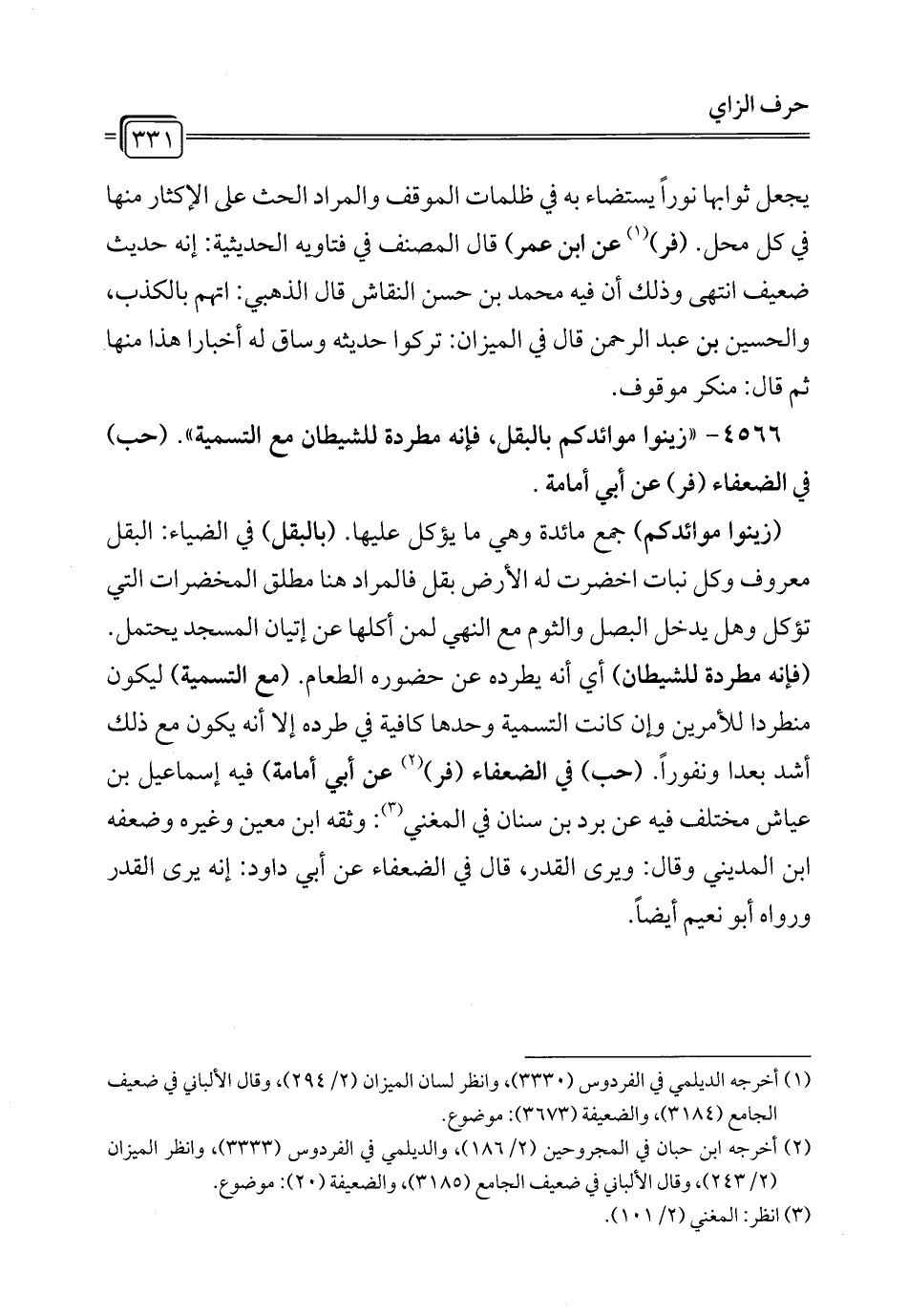 4566 - "زينوا موائدكم بالبقل، فإنه مطردة للشيطان مع التسمية". (حب) في الضعفاء (فر) عن أبي أمامة.