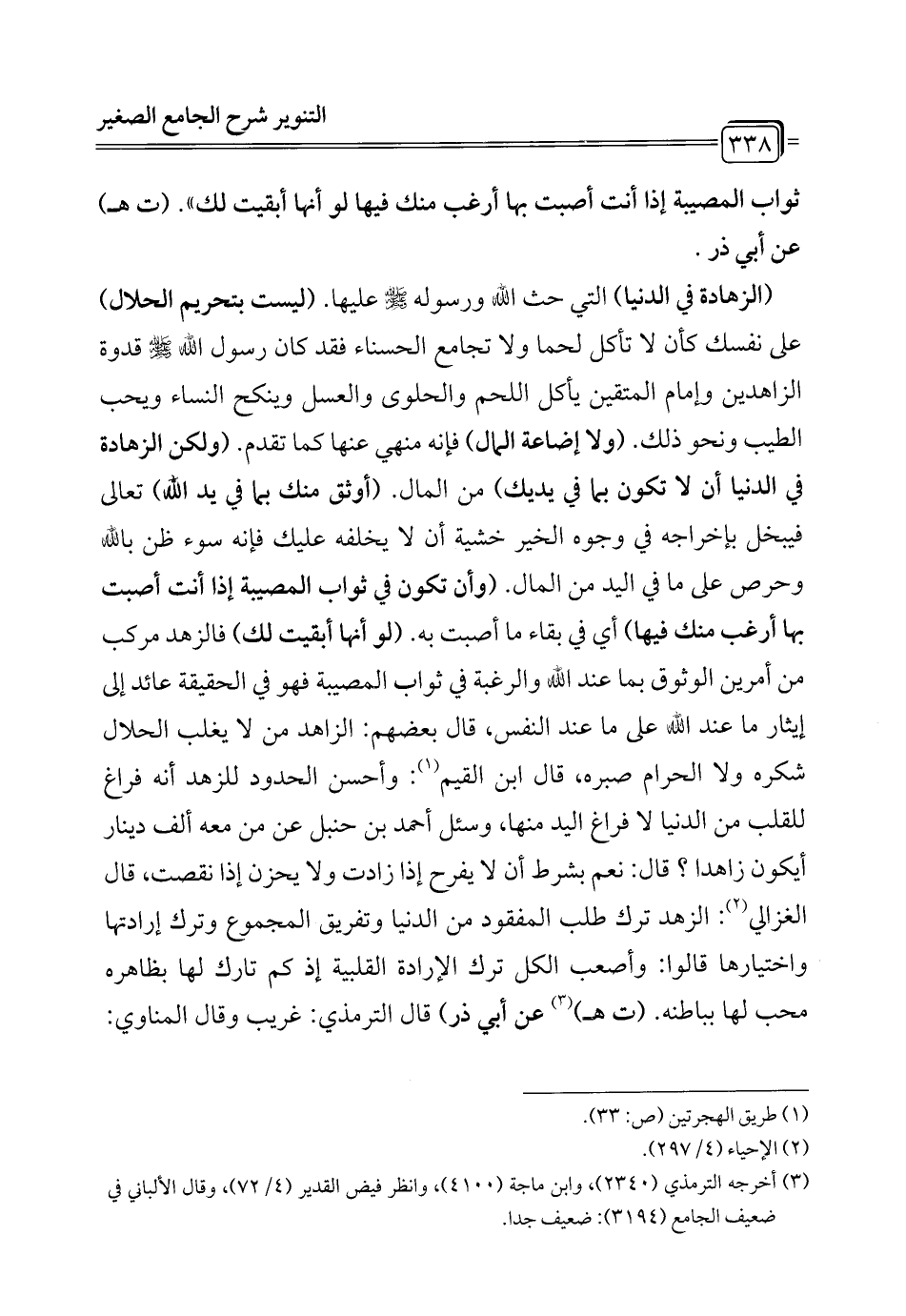 (الزهادة في الدنيا) التي حث الله ورسوله - صلى الله عليه وسلم - عليها. (ليست بتحريم الحلال) على نفسك كأن لا تأكل لحما ولا تجامع الحسناء فقد كان رسول الله قدوة الزاهدين وإمام المتقين يأكل اللحم والحلوى والعسل وينكح النساء ويحب الطيب ونحو ذلك. (ولا إضاعة المال) فإنه منهي عنها كما تقدم. (ولكن الزهادة في الدنيا أن لا تكون بما في يديك) من المال. (أوثق منك بما في يد الله) تعالى فيبخل بإخراجه في وجوه الخير خشية أن لا يخلفه عليك فإنه سوء ظن بالله وحرص على ما في اليد من المال. (وأن تكون في ثواب المصيبة إذا أنت أصبت بها أرغب منك فيها) أي في بقاء ما أصبت به. (لو أنها أبقيت لك) فالزهد مركب من أمرين الوثوق بما عند الله والرغبة في ثواب المصيبة فهو في الحقيقة عائد إلى إيثار ما عند الله على ما عند النفس، قال بعضهم: الزاهد من لا يغلب الحلال شكره ولا الحرام صبره، قال ابن القيم (¬1): وأحسن الحدود للزهد أنه فراغ للقلب من الدنيا لا فراغ اليد منها، وسئل أحمد بن حنبل عن من معه ألف دينار أيكون زاهدا؟ قال: نعم بشرط أن لا يفرح إذا زادت ولا يحزن إذا نقصت، قال الغزالي (¬2): الزهد ترك طلب المفقود من الدنيا وتفريق المجموع وترك إرادتها واختيارها قالوا: وأصعب الكل ترك الإرادة القلبية إذ كم تارك لها بظاهره محب لها بباطنه. (ت هـ) (¬3) عن أبي ذر) قال الترمذي: غريب وقال المناوي: