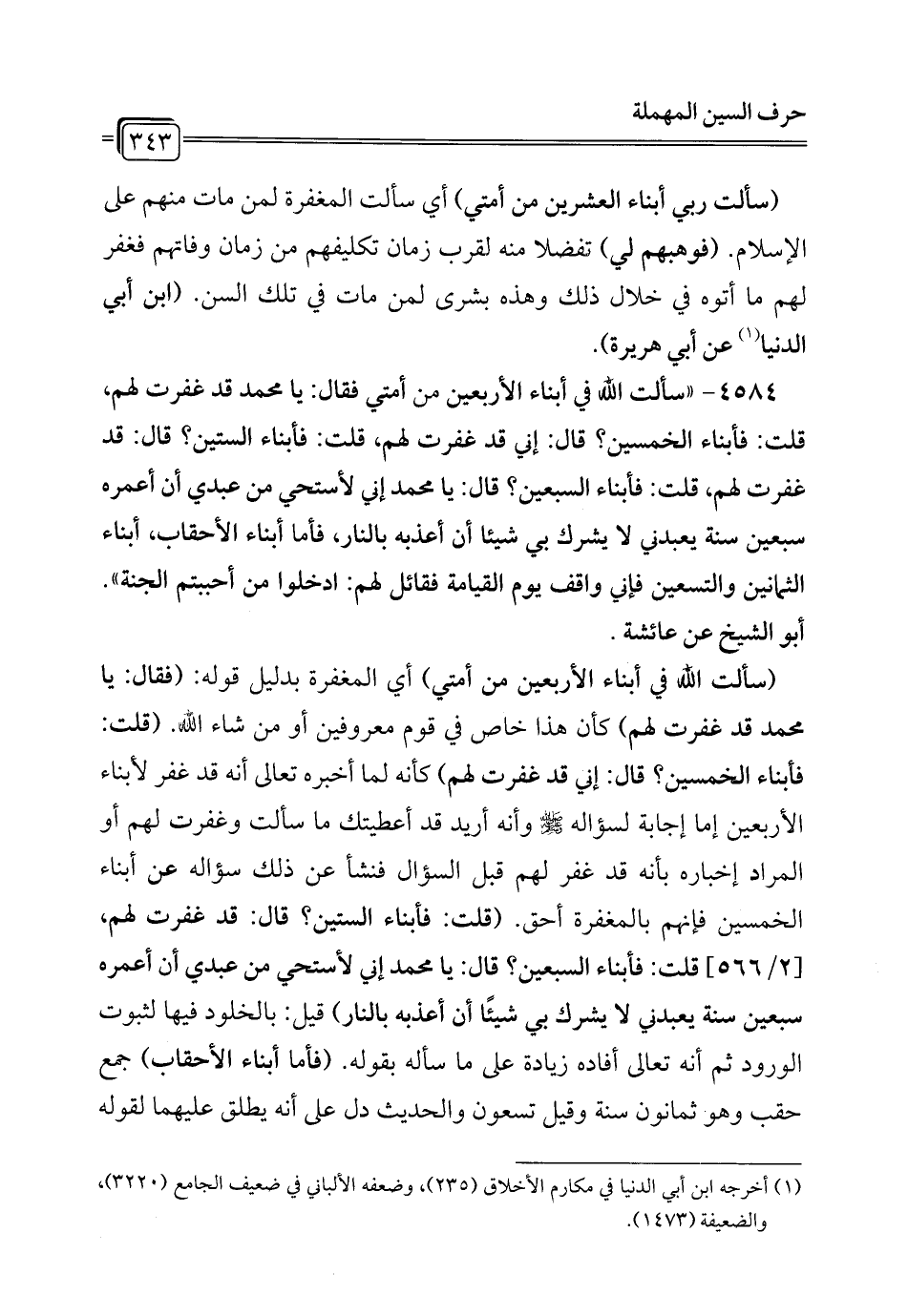 4584 - "سألت الله في أبناء الأربعين من أمتي فقال: يا محمَّد قد غفرت لهم، قلت: فأبناء الخمسين؟ قال: إني قد غفرت لهم، قلت: فأبناء الستين؟ قال: قد غفرت لهم، قلت: فأبناء السبعين؟ قال: يا محمَّد إني لأستحي من عبدي أن أعمره سبعين سنة يعبدني لا يشرك بي شيئاً أن أعذبه بالنار، فأما أبناء الأحقاب، أبناء الثمانين والتسعين فإني واقف يوم القيامة فقائل لهم: ادخلوا من أحببتم الجنة". أبو الشيخ عن عائشة.