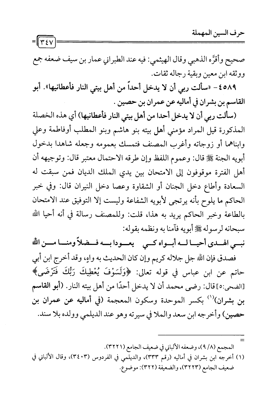 4589 - "سألت ربي أن لا يدخل أحداً من أهل بيتي النار فأعطانيها". أبو القاسم بن بشران في أماليه عن عمران بن حصين.