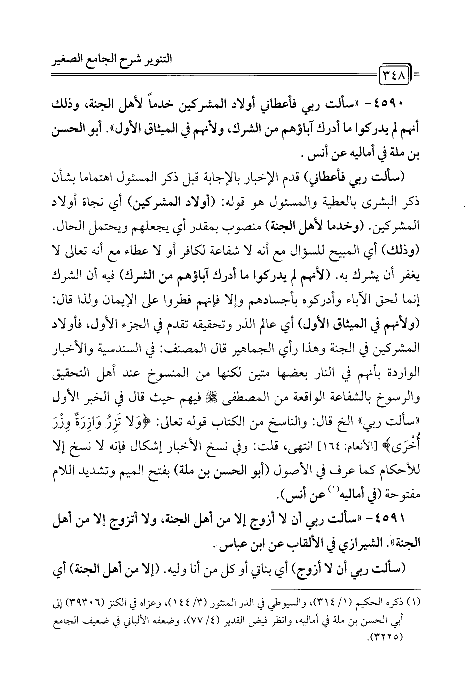 4590 - "سألت ربي فأعطاني أولاد المشركين خدماً لأهل الجنة، وذلك أنهم لم يدركوا ما أدرك آباؤهم من الشرك، ولأنهم في الميثاق الأول". أبو الحسن بن ملة في أماليه عن أنس.