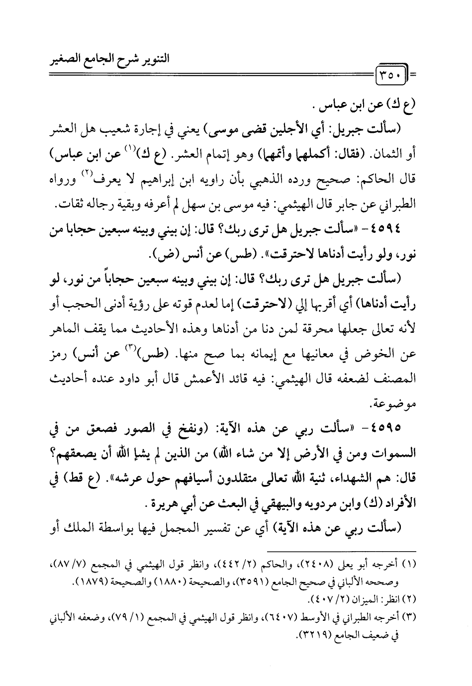 4594 - "سألت جبريل هل ترى ربك؟ قال: إن بيني وبينه سبعين حجابا من نور، ولو رأيت أدناها لاحترقت". (طس) عن أنس (ض).