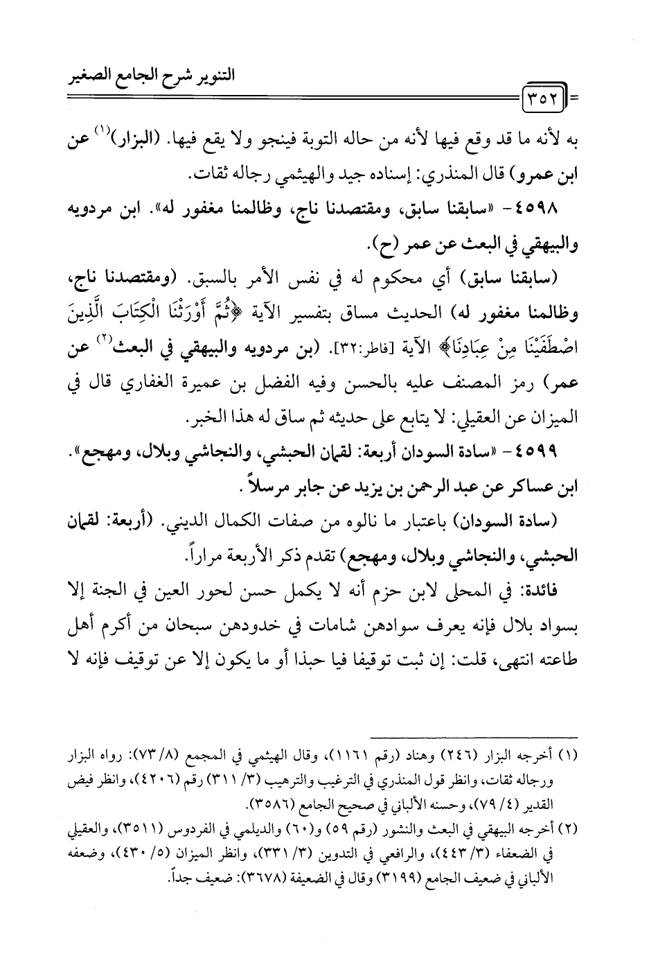 4599 - "سادة السودان أربعة: لقمان الحبشي، والنجاشي وبلال، ومهجع". ابن عساكر عن عبد الرحمن بن يزيد عن جابر مرسلاً.