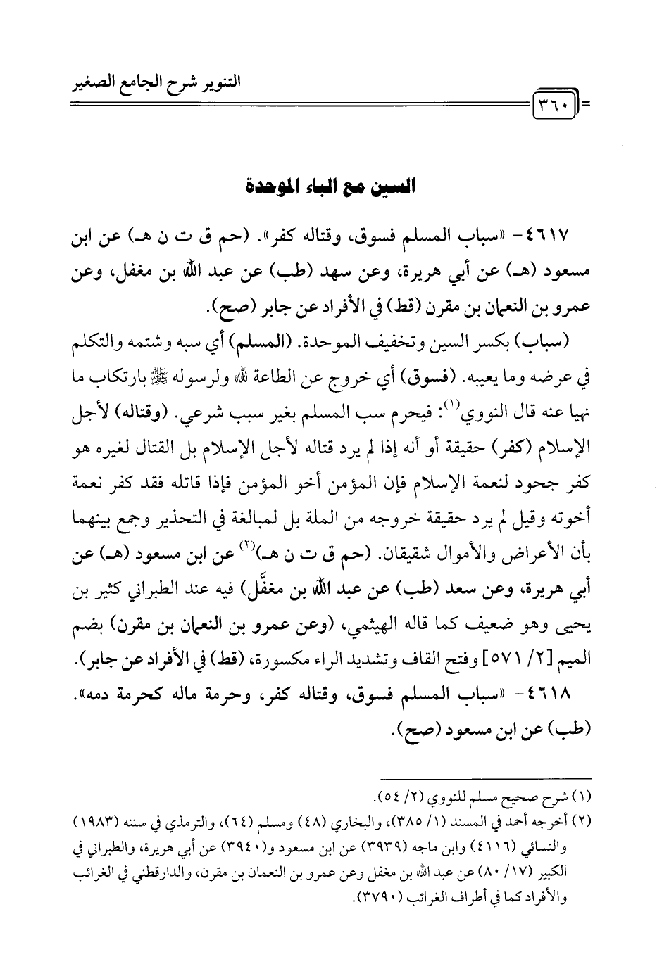 (سباب) بكسر السين وتخفيف الموحدة. (المسلم) أي سبه وشتمه والتكلم في عرضه وما يعيبه. (فسوق) أي خروج عن الطاعة لله ولرسوله - صلى الله عليه وسلم - بارتكاب ما نهيا عنه قال النووي (¬1): فيحرم سب المسلم بغير سبب شرعي. (وقتاله) لأجل الإِسلام (كفر) حقيقة أو أنه إذا لم يرد قتاله لأجل الإِسلام بل القتال لغيره هو كفر جحود لنعمة الإِسلام فإن المؤمن أخو المؤمن فإذا قاتله فقد كفر نعمة أخوته وقيل لم يرد حقيقة خروجه من الملة بل لمبالغة في التحذير وجمع بينهما بأن الأعراض والأموال شقيقان. (حم ق ت ن هـ) (¬2) عن ابن مسعود (هـ) عن أبي هريرة، وعن سعد (طب) عن عبد الله بن مغفَّل) فيه عند الطبراني كثير بن يحيى وهو ضعيف كما قاله الهيثمي، (وعن عمرو بن النعمان بن مقرن) بضم الميم [2/ 571] وفتح القاف وتشديد الراء مكسورة، (قط) في الأفراد عن جابر).