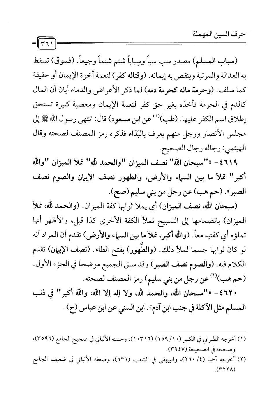 (سبحان الله، نصف الميزان) أي يملأ ثوابها كفة الميزان. (والحمد لله، تملأ الميزان) بانضمامها إلى التسبيح تملأ الكفة الأخرى كذا قيل، والأظهر أنها تملؤه أي كفتيه معاً. (والله أكبر، تملأ ما بين السماء والأرض) تقدم أن المراد أنه لو كان ثوابها جسما لملأ ذلك. (والطَّهور) بفتح الطاء. (نصف الإيمان) تقدم الكلام فيه. (والصوم نصف الصبر) وقد سبق الجميع موضحا في الجزء الأول. (حم هب) (¬2) عن رجل من بني سليم) رمز المصنف لصحته.