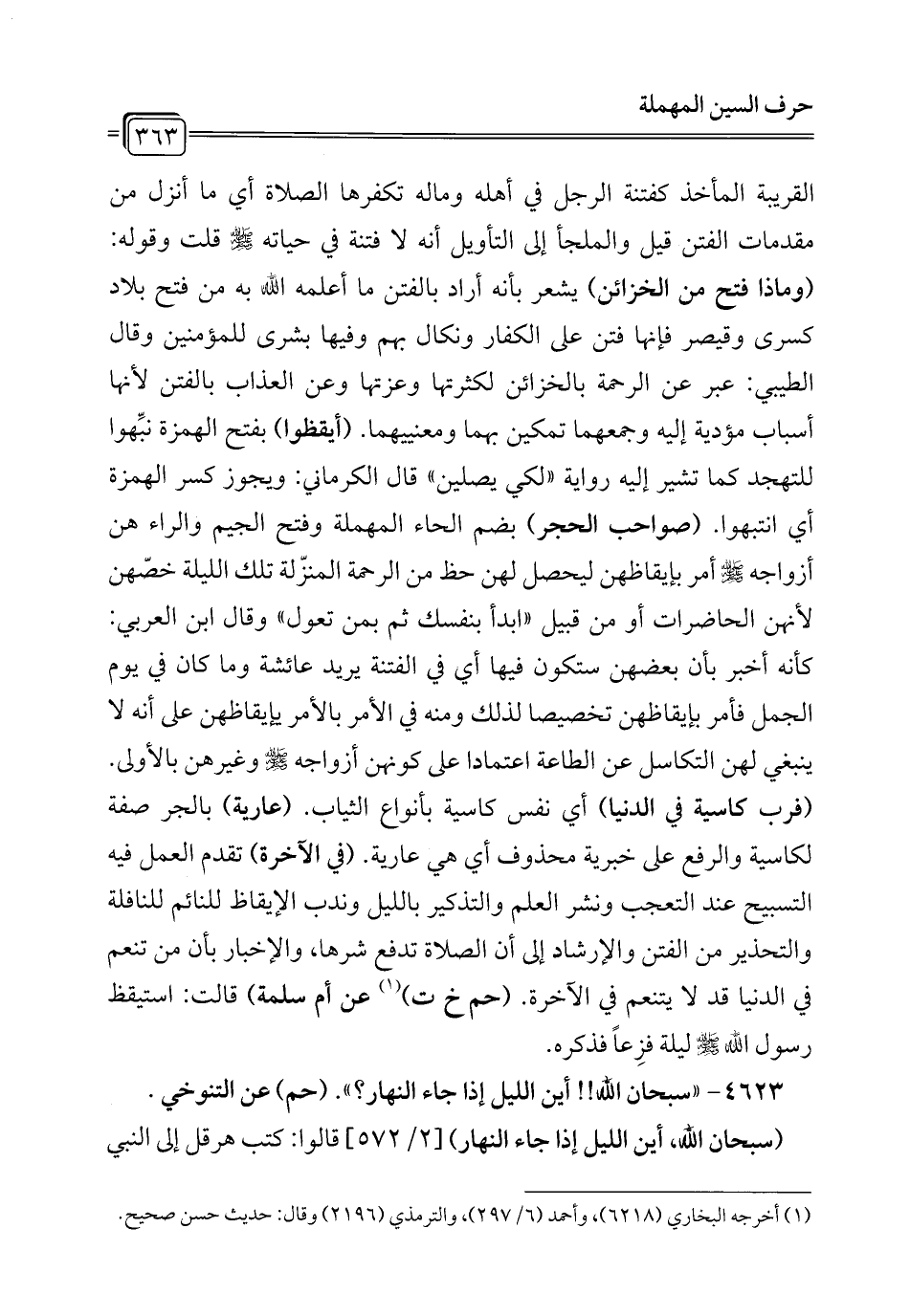 القريبة المأخذ كفتنة الرجل في أهله وماله تكفرها الصلاة أي ما أنزل من مقدمات الفتن قيل والملجأ إلى التأويل أنه لا فتنة في حياته - صلى الله عليه وسلم - قلت وقوله: (وماذا فتح من الخزائن) يشعر بأنه أراد بالفتن ما أعلمه الله به من فتح بلاد كسرى وقيصر فإنها فتن على الكفار ونكال بهم وفيها بشرى للمؤمنين وقال الطيبي: عبر عن الرحمة بالخزائن لكثرتها وعزتها وعن العذاب بالفتن لأنها أسباب مؤدية إليه وجمعهما تمكين بهما ومعنييهما. (أيقظوا) بفتح الهمزة نبِّهوا للتهجد كما تشير إليه رواية "لكي يصلين" قال الكرماني: ويجوز كسر الهمزة أي انتبهوا. (صواحب الحجر) بضم الحاء المهملة وفتح الجيم والراء هن أزواجه - صلى الله عليه وسلم - أمر بإيقاظهن ليحصل لهن حظ من الرحمة المنزّلة تلك الليلة خصّهن لأنهن الحاضرات أو من قبيل "ابدأ بنفسك ثم بمن تعول" وقال ابن العربي: كأنه أخبر بأن بعضهن ستكون فيها أي في الفتنة يريد عائشة وما كان في يوم الجمل فأمر بإيقاظهن تخصيصا لذلك ومنه في الأمر بالأمر يإيقاظهن على أنه لا ينبغي لهن التكاسل عن الطاعة اعتمادا على كونهن أزواجه - صلى الله عليه وسلم - وغيرهن بالأولى. (فرب كاسية في الدنيا) أي نفس كاسية بأنواع الثياب. (عارية) بالجر صفة لكاسية والرفع على خبرية محذوف أي هي عارية. (في الآخرة) تقدم العمل فيه التسبيح عند التعجب ونشر العلم والتذكير بالليل وندب الإيقاظ للنائم للنافلة والتحذير من الفتن والإرشاد إلى أن الصلاة تدفع شرها، والإخبار بأن من تنعم في الدنيا قد لا يتنعم في الآخرة. (حم خ ث) (¬1) عن أم سلمة) قالت: استيقظ رسول الله - صلى الله عليه وسلم - ليلة فزِعاً فذكره.