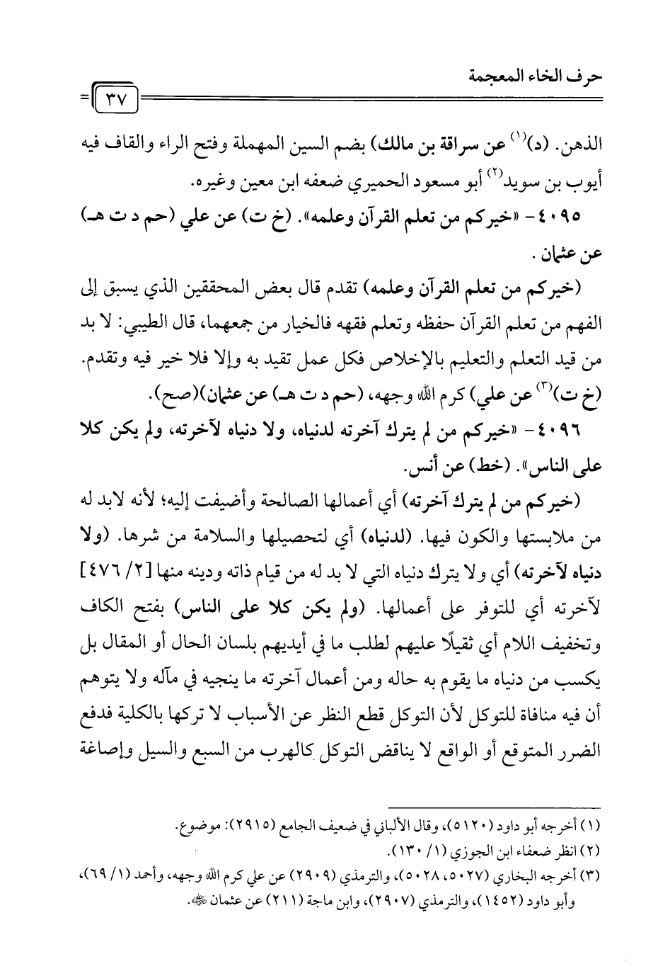 (¬3) أخرجه البخاري (5027، 5028)، والترمذي (2909) عن علي كرم الله وجهه، وأحمد (1/ 69)، وأبو داود (1452)، والترمذي (2907)، وابن ماجة (211) عن عثمان - رضي الله عنه -.